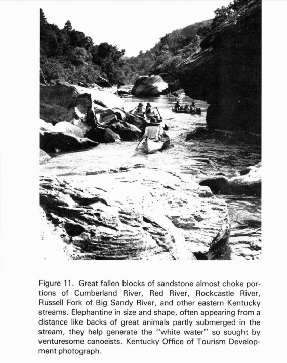 The edge of the Cumberland Plateau is bounded by an escarpment that rises several hundred feet above the adjacent lowland. It contains some of the most scenic areas in Kentucky. Massive, cliff forming sandstones of Early Pennsylvanian age which cap the escarpment and upland are resistant to erosion and produce rugged, picturesque landscape features. Precipitous cliffs, craggy pinnacles, rocky gorges, rock shelters natural bridges, cascading waterfalls, and other natural features abound there. Towering walls of conglomeratic sandstone hem in the narrow drainage valleys with massive ledges and overhanging cliffs. Weathering and erosion have created fascinating etched and pitted patterns in some of the rock. Limestone ledges underlie the sandstones and are the locale of caves, springs, and sinking creeks.