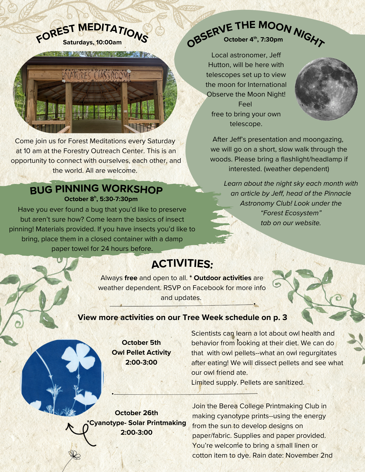 Interested in what the FOC might be planning, want to see pictures of different plants native to this area, or maybe you just want to see what the phases of the moon will be this month? Plan something with the family, take some time to yourself on the trails, or join a group hike where you can walk with an ecologist! All of our events are free and open to all.