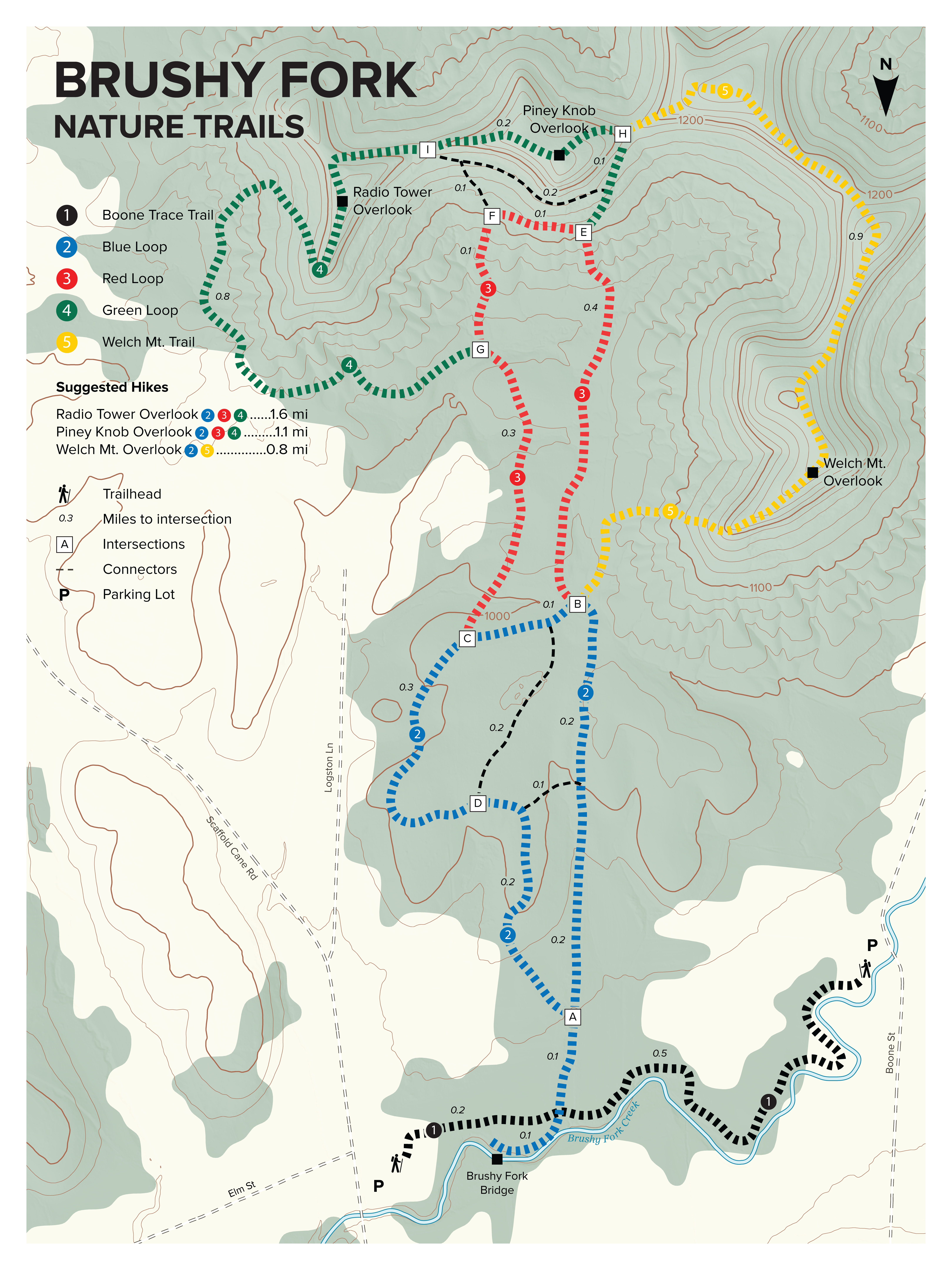Located right behind Berea College's campus, these trails are a great, convenient way for students and community members to enjoy nature. Brushy Fork has several different loop hikes possible with different distances and difficulties. The easiest combination for the Brushy Fork hike would be to start on the blue trail, then use then use the black connector trail(s) and continue on the blue to make a loop.
