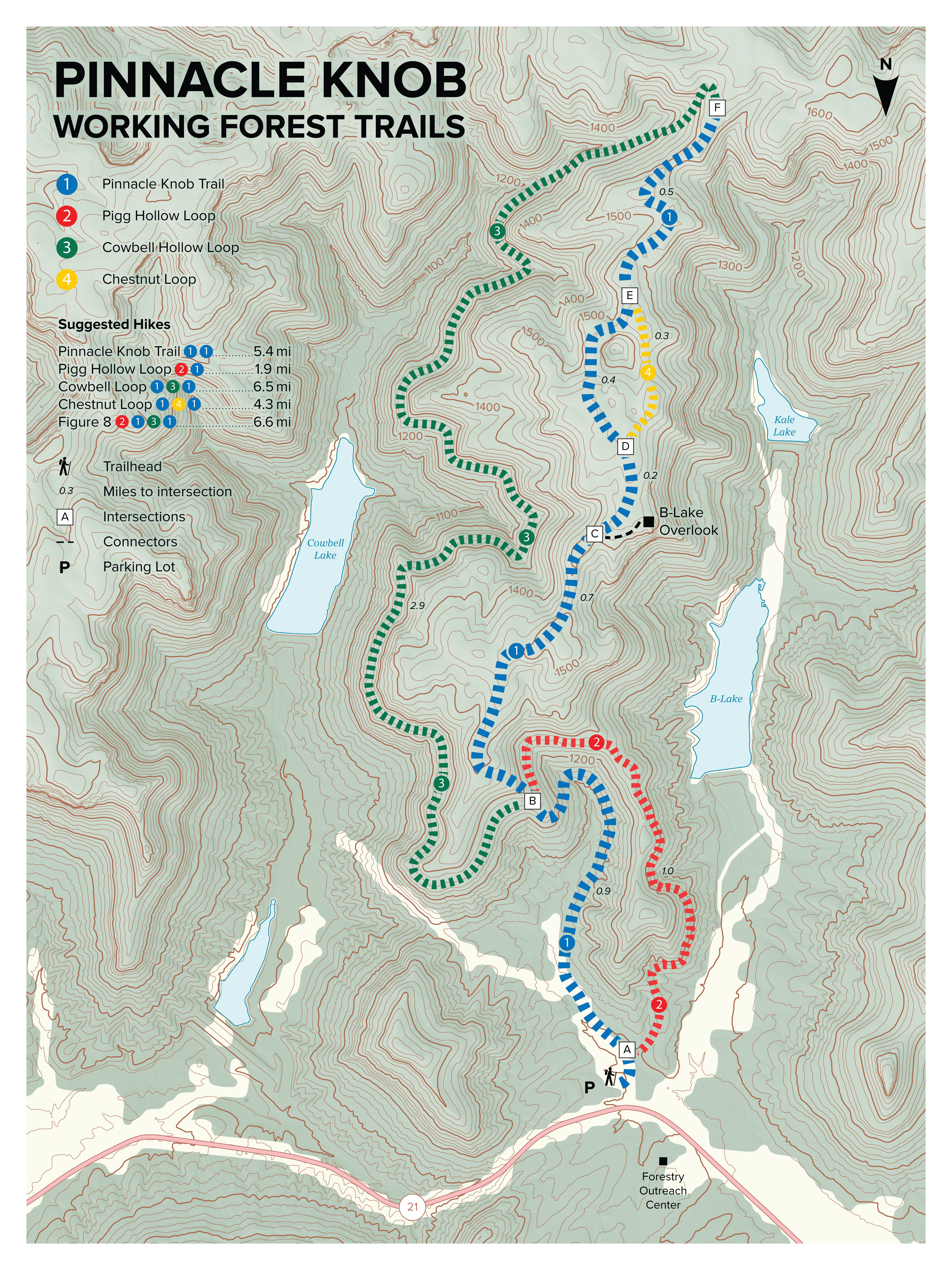 The Pinnacle Knob trail system extends over seven miles, featuring a “Figure 8” configuration which can be hiked in its entirety or hikers can just take the first loop for a two mile hike. The theme of the trail is that this is a “working forest” where forest management has been taking place since 1908. Along the way, educational signs share fascinating forest management topics and include quotes from the first management plan written for the Berea College Forest by Silas Mason, the college’s first Forester (1907-1917). Silas Mason was perhaps the first forester in American who sought to incorporate multiple use management. His goal was to manage the Berea College Forest not only for sustainable timber production, but also for clean drinking water, recreation and education. His original idea to invite the public into the forest, on old logging roads, to see and learn about a working forest, is honored through this trail which takes visitors through the center of the Berea College Forest where many forest management activities have occurred, and continue to be implemented.